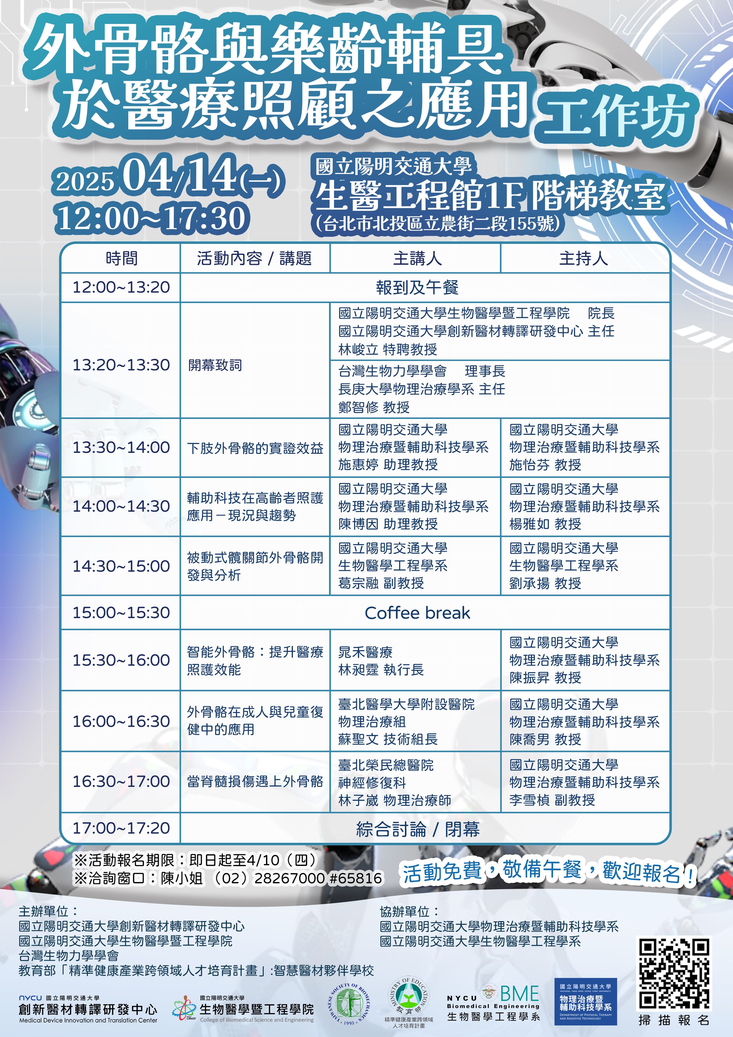 主辦單位:國立陽明交通大學創新醫材轉譯研發中心、國立陽明交通大學生物醫學暨工程學院、台灣生物力學學會、教育部「精準健康產業跨領域人才培育計畫」: 智慧醫材夥伴學校