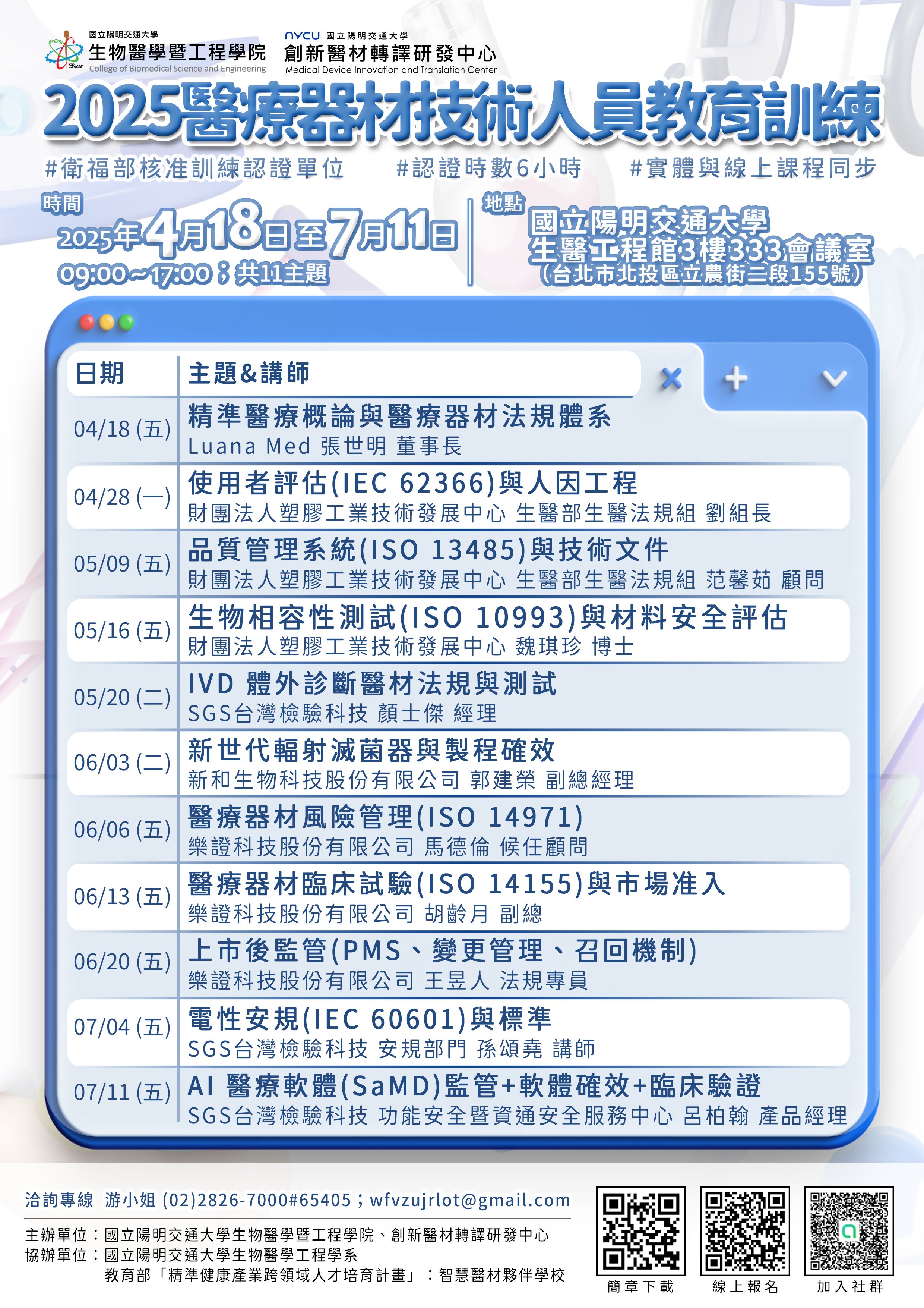 想知道醫療器材技術人員教育訓練?! 快來了解~把握機會~趕緊加入陽明交通大學開設系列課程!